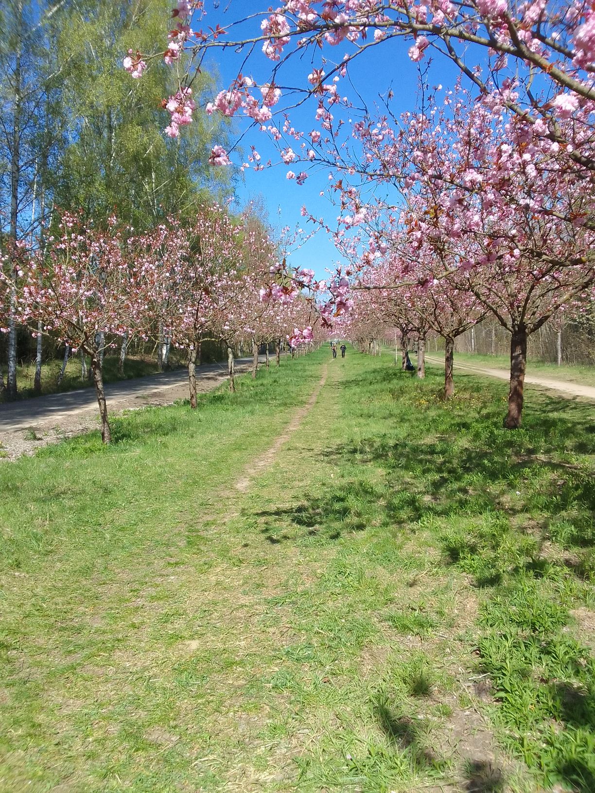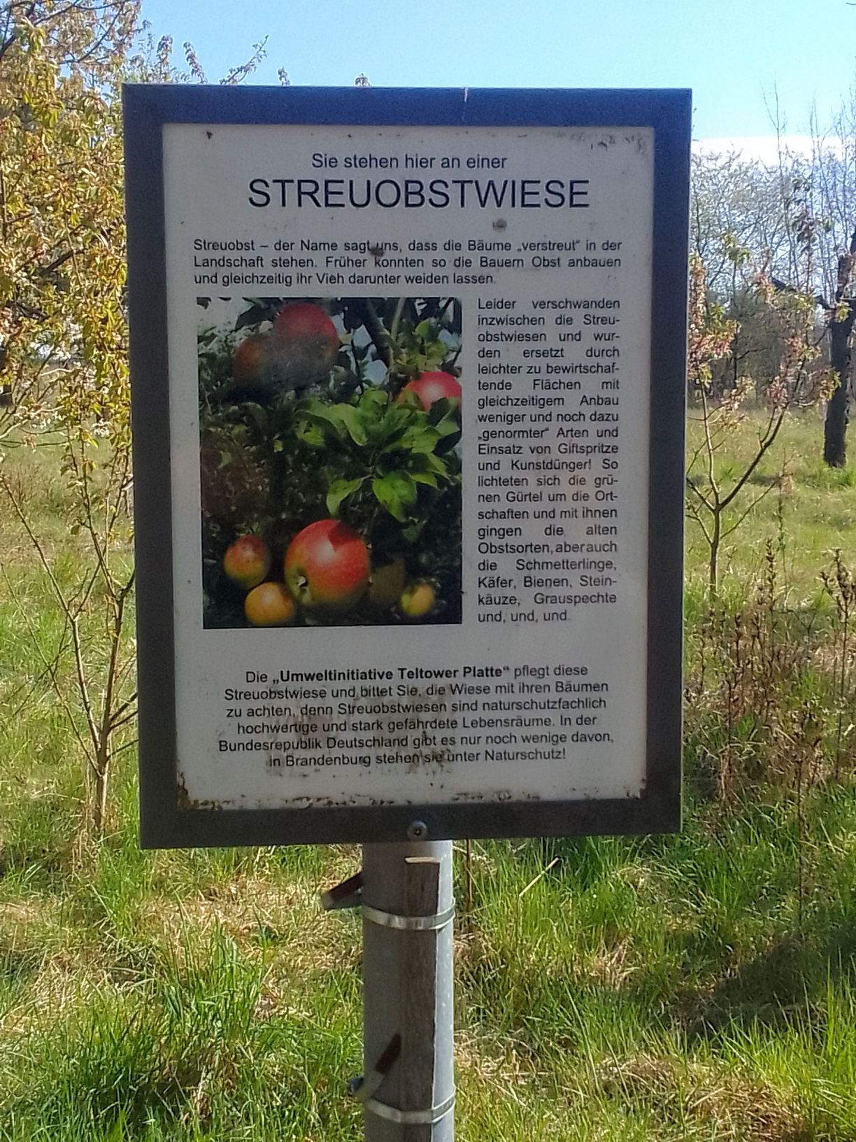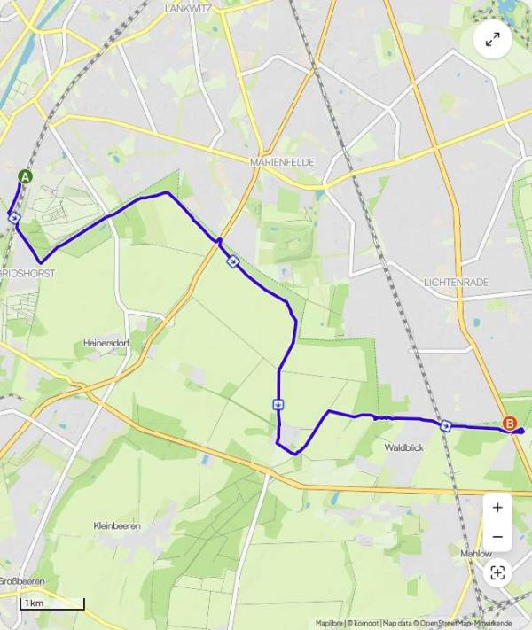 Unsere Route startete am S-Bahnhof Lichterfelde Süd und führte uns entlang des Mauerweges durch die vom japanischen TV-Sender Asashi zur deutschen Wiedervereinigung gestifteten Kirschblütenallee. Es handelt sich hierbei um die längste Kirschblütenallee in Berlin. Entgegen unserer ursprünglichen Pläne haben wir unsere Tour aber nicht bis Mahlow fortgesetzt, sondern haben stattdessen einen kleinen Umweg im das Dörfchen Birkholz gemacht (leider war der dortige Biergarten “Sohny's Hexenhaus” geschlossen) und sind zur Streuobstwiese auf der Teltower Platte gewandert. Von dort hat uns der Bus zum S-Bahnhof Lichtenrade zurück in die Innenstadt gebracht.